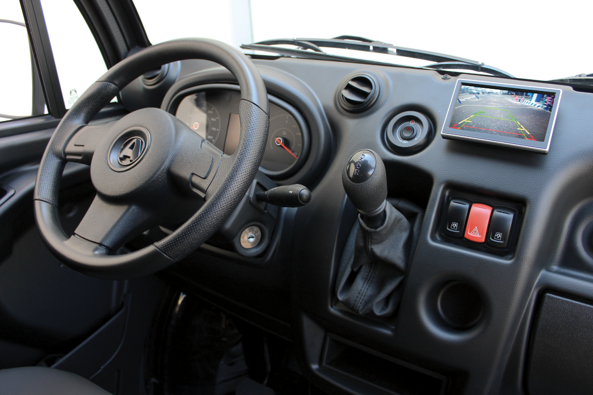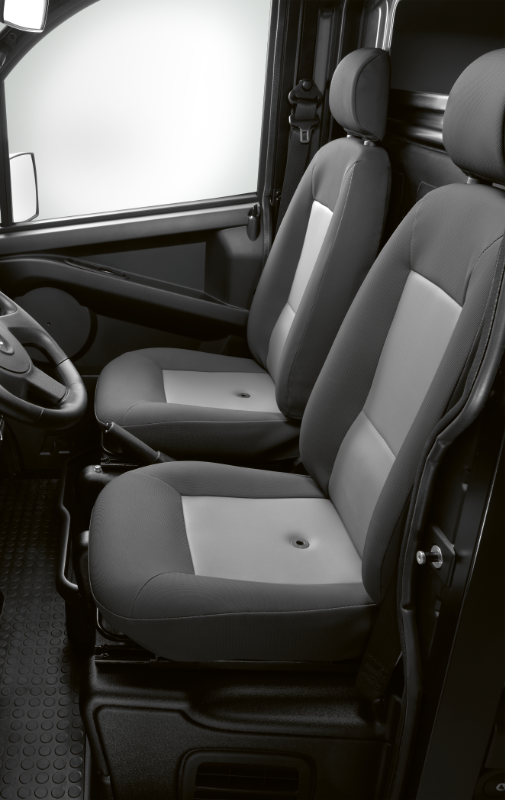 Serienausstattung, 12 Volt Steckdose, Ablagefächer in Türen und vor Beifahrersitz, Abschließbarer Tankdeckel, Armaturenbrett mit moderner Automobil-Spritzgusstechnik, Außenspiegel links und rechts (von innen einstellbar), Ersatzschlüssel, Fußmatten aus Gummi, Handschuhfach mit Münz- und Getränkehalter, Heckfenster in der Kabine, Hecktüren abschließbar, Heizungslüftung mit zwei Stufen, Innenbeleuchtung mit Türkontaktschaltern, Innenspiegel mit Abblendfunktion, Kabinendach schallisoliert, Kopfstützen, LED Tagfahrlicht, Leichtgängige Lenkung, Lenkradschloss, Luftausströmer, Radiovorbereitung, Radzierblenden, Rückfahrscheinwerfer rechts, Nebelschlussleuchte links, Nutzlastbefestigungshaken (4 Stk.), Schalldämmung Fahrgastzelle und Motorraum, Schalthebel in Armaturenbrett, Scheibenwischer mit Doppelarm, inkl. Intervallschaltung und elektrischer Scheibenwaschanlage, Sicherheitsgurte Automatik, Signalhorn elektrisch, Signalton «Licht an» , Sitze in Längsrichtung verstellbar, Sonnenblende Fahrer und Beifahrer, Stahlfelgen 13 Zoll, Tageskilometerzähler, Türgriffe außen schwarz matt, Warnblinkanlage mit automatischer Aktivierung bei Vollbremsung, Wegfahrsperre bei eingelegtem Gang